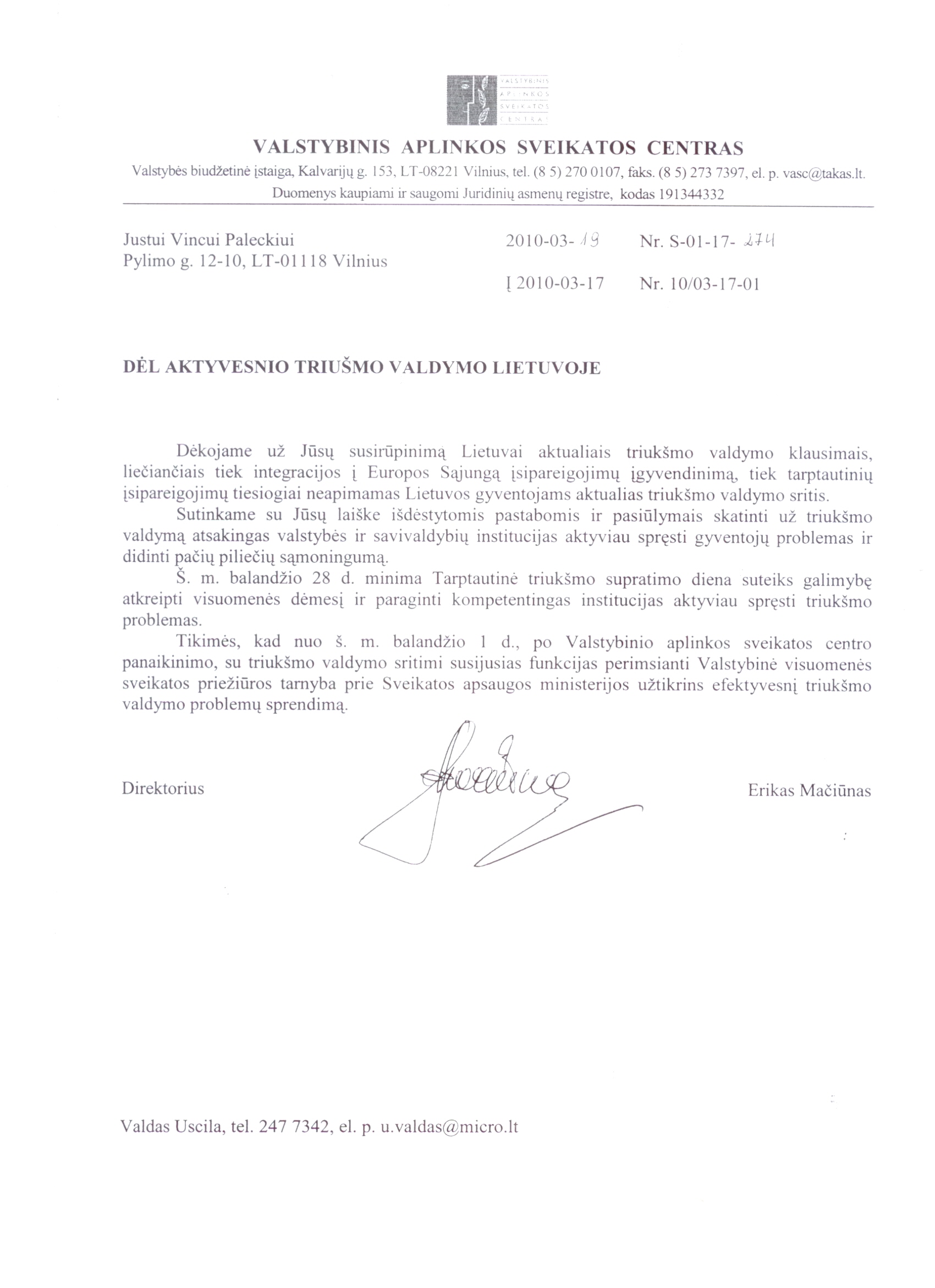 Į Justo Paleckio 2010 m. kovo 17 d. laišką dėl aktyvesnio triukšmo valdymo Lietuvoje buvo gautas Valstybinio aplinkos sveikatos centro direktoriaus Eriko Mačiūno atsakymas. Atsakymo tekstą rasite pridėtame dokumente (pdf formatu).