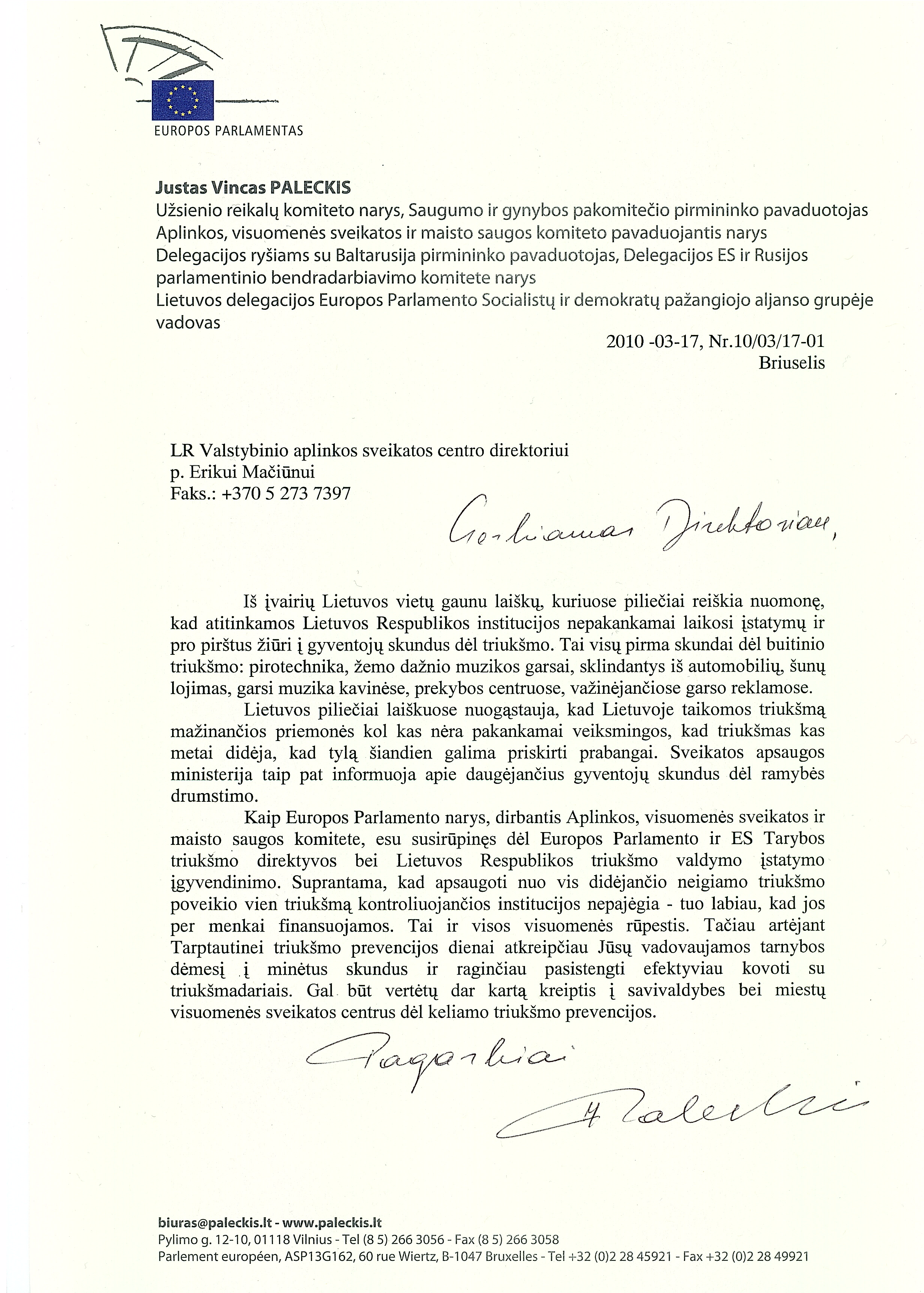 Kokias būdais Lietuvoje yra bandoma įgyvendinti šios deklaracijos nuostatas bei informuoti visuomenę apie šį susirgimą ir gerinti prieigą prie informacijos apie šią ligą? Koks yra šios ligos reglamentavimas bei gydymo ir diagnozavimo būdai Lietuvoje? Pagarbiai, Justas Vincas Paleckis Sveikatos apsaugos ministro atsakymo tekstą rasite pridėtame dokumente (pdf formatu). Iš įvairių Lietuvos vietų Justas gauna laiškų, kuriuose piliečiai reiškia nuomonę, kad atitinkamos Lietuvos Respublikos institucijos nepakankamai laikosi įstatymų ir pro pirštus žiūri į gyventojų skundus dėl triukšmo. Dėl šios priežasties Justas Paleckis kreipėsi į LR Valstybinio aplinkos sveikatos centro direktorių p. Erikui Mačiūną.