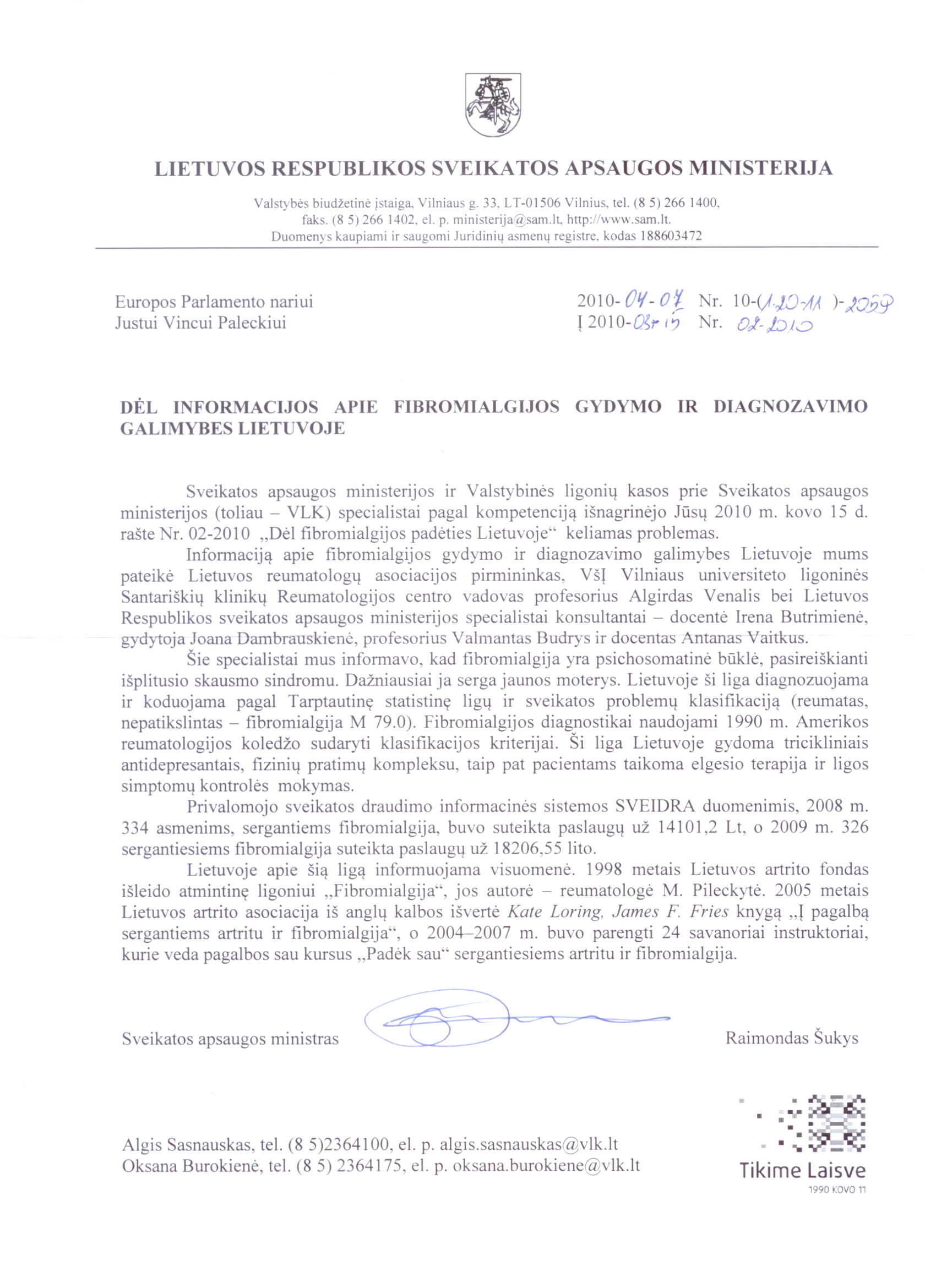 Romualdas Navickas Kretinga Lietuvos Respublikos sveikatos apsaugos ministrui p. Raimondui Šukiui 2010 03 10, Nr. 02-2010, Vilnius Europos Parlamentas 2009 m. sausio 13 dieną, atsižvelgdamas į Darbo tvarkos taisyklių 116 straipsnį, priėmė deklaraciją dėl fibromialgijos. Ši deklaracija buvo priimta atsižvelgiant į tai, jog daugiau kaip 14 milijonų Europos Sąjungos gyventojų ir nuo 1 iki 3 proc. pasaulio gyventojų kenčia nuo fibromialgijos, o nuo 1992 m. Pasaulio sveikatos organizacija fibromialgiją pripažino liga, tačiau ji vis dar nėra kodifikuota ir įtraukta į ES susirgimų sąvadą, o dėl to ligoniams negali būti oficialiai nustatyta minėtoji diagnozė. Ši deklaracija ragino: