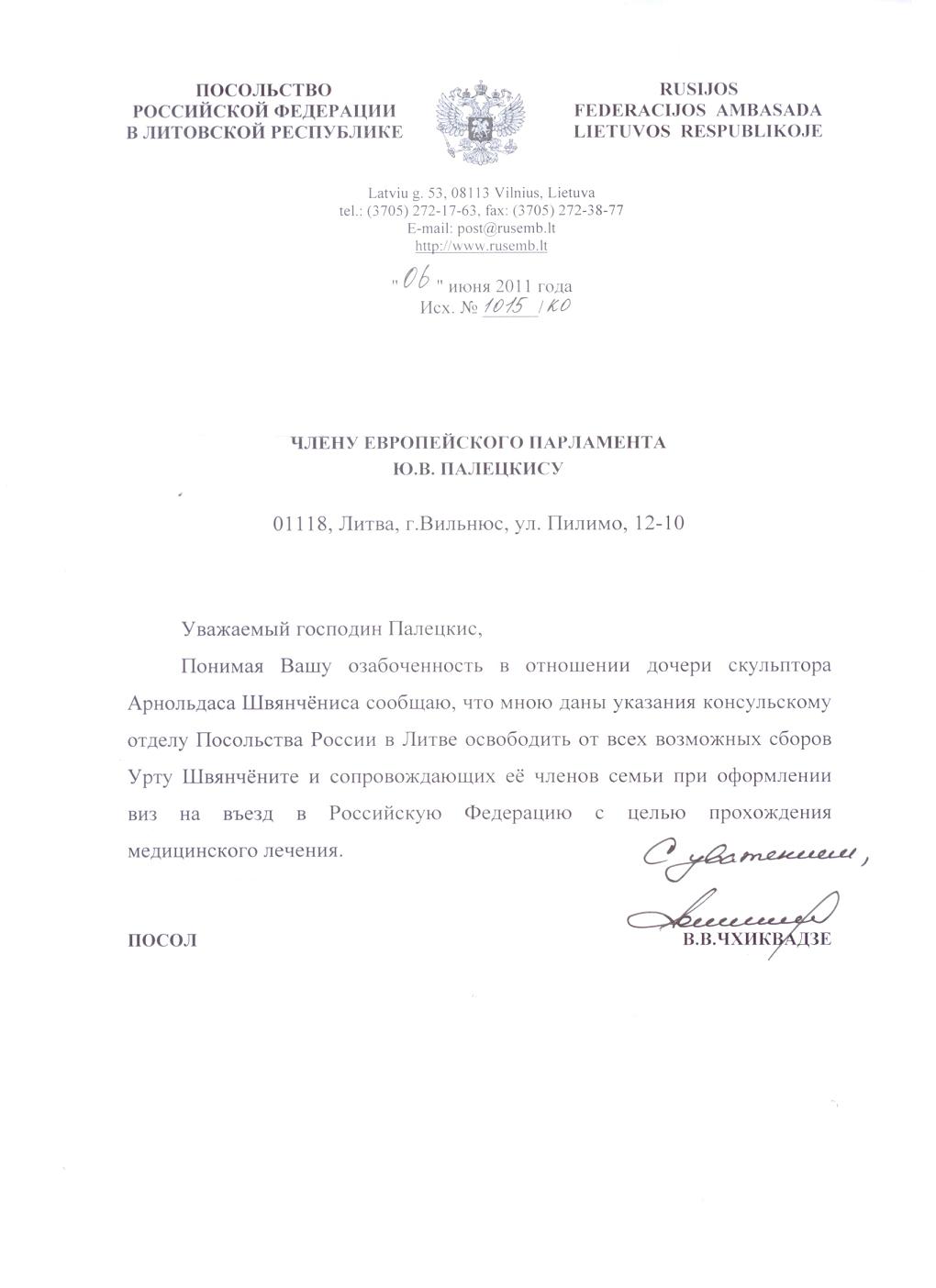 | Laiškai ir komentarai2013 m. liepos 15 d. Justas Paleckis gavo Mikhailo Khodorkovskio įgalioto konsultacinės kontoros "Fortzer", besispecializuojančios užsienio politikos, tarptautinių ryšių, diplomatijos ir filantropijos srityse, dirbančios su politikais ar su politika susijusiais įtakingais asmenimis, direktoriaus Stefeno Džounso (Stephen Jones) laišką. Jame S. Džounsas primena, kad M. Khodorkovskio apeliaciją Aukščiausiame teisme numatyta svarstyti š.m. rugpjūčio 6 d., o spalio 25 d. sueis 10 metų, kai M. Chodorkovskis yra įkalintas. Taip pat Stefenas Džounsas persiuntė Michailo Chodorkovskio laišką Justui Paleckiui: Michailo Chodorkovskio laiškas Justui Paleckiui. 2013 m. liepos 19 d. Justas atsakė Michailui Chodorkovskiui: Justo Paleckio atsakymas. Po ES-Rusijos parlamentinio bendradarbiavimo darbo grupės išvažiuojamojo posėdžio grįždamas iš Sočio per Maskvą į Lietuvą, Justas Vnukovo oro uoste susipažino su gal penkerių metų mergaite, kurią mama ir - matyt brolis - vis laikė ant rankų. Lėktuve jų vietos pasitaikė šalia. Mergaitė vardu Urtė negali vaikščioti, jai reikalinga kamieninių ląstelių terapija. Ją reguliariai atlieka Rusijoje. Justo Paleckio kreipimosi laiškas Rusijos ambasadoriui Lietuvoje 2011 m. birželio 7 d. gavome laišką iš Rusijos ambasados Lietuvoje Konsulinio skyriaus, pasirašytą ambasadoriaus Vladimiro Viktorovičiaus Čchikvadzės: Gavome laišką dėl apskritojo stalo diskusijos dėl visuomenės nuomonės, liečiančios atominės elektrinės statybas Kaliningrade. Laiškas rusų kalba: